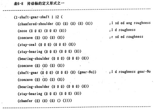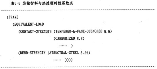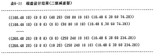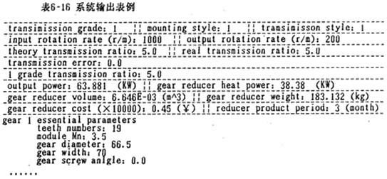 圓柱齒輪減速器設(shè)計(jì)完成后,其結(jié)果為一系列表(LISP 語(yǔ)言形式)組成的結(jié)果。為了使專(zhuān)家系統(tǒng)的結(jié)果方便地被用戶(hù)所理解,系統(tǒng)設(shè)置有相應(yīng)的輸出函數(shù),并以表格的形式,輸出所需的設(shè)計(jì)數(shù)據(jù)。下表(表6-16 )為專(zhuān)家系統(tǒng)設(shè)計(jì)的一一級(jí)圓柱齒輪減速器的示例。
