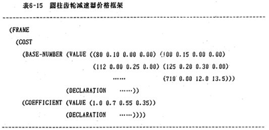 1.圓柱齒輪減速器價(jià)格主要考慮齒輪材料、精度,減速器中心距,總重量等因素,如表6-14。專(zhuān)家系統(tǒng)設(shè)計(jì)中,可用框架表示(表6-15 ):