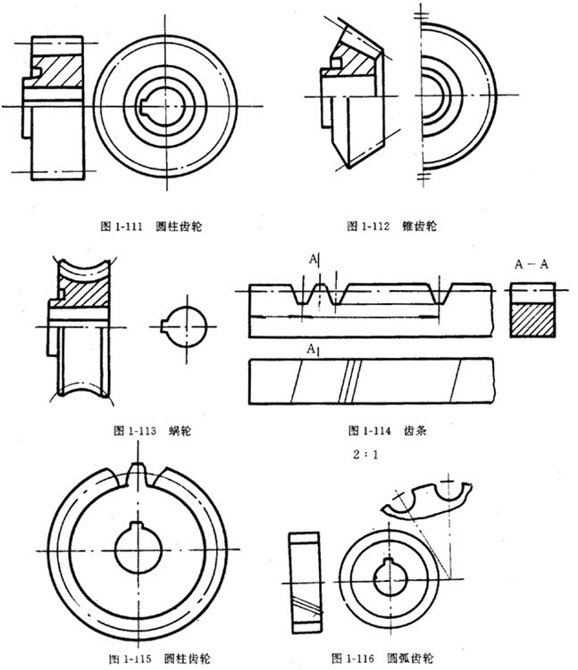 ③在剖視圖中,當(dāng)剖切平面通過齒輪的軸線時,輪齒一律按不剖處理(圖1-111、1-112、1-113、1-114、1-117)。