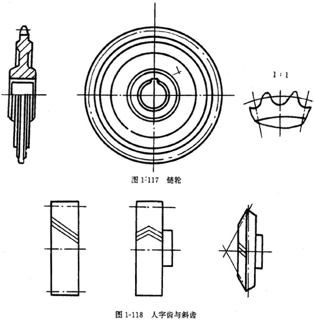 ⑤當(dāng)需要表示齒線的形狀時,可用三條與齒線方向一致的細實線表示(圖1-116、1-118)。直齒則不需表示。