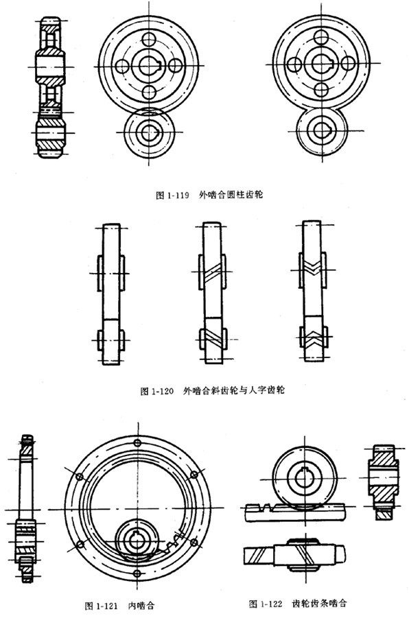 ⑤圓柱齒輪嚙合的畫法見圖1-119。外嚙合斜齒輪與人字齒輪見圖1-120!
