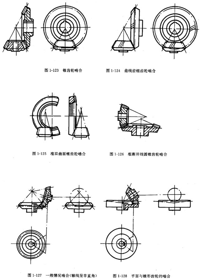 ③在圓柱齒輪嚙合、齒輪齒條嚙合和圓錐齒輪嚙合的剖視圖中,當(dāng)剖切平面通過兩嚙合齒輪的軸線時,在嚙合區(qū)內(nèi),將一個齒輪的輪齒用粗實線繪制,另一個齒輪的輪齒被遮擋的部分用虛線繪制(圖1-119、1-1251、1-125、1-128);也可省略不畫(圖1-122、1-123、1-127)。