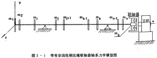 在第三章,根據(jù)試驗的基礎建立了具有非線性遲滯特性聯(lián)袖器的恢復力模型。這一章,將研究一個帶有這種聯(lián)軸器的軸系如圖5-1所示,該軸系有n個圓盤,由鋼絲繩聯(lián)軸器與主機相連接,按以下原則建立力學模型: