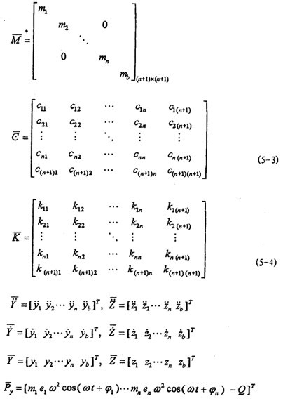 當主機以角速度ω轉動時,軸系在各偏心力的作用下產生穩(wěn)態(tài)振動,其運動微分方程可表示為: