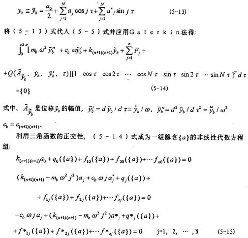 {fj({ a(k)})}是式(5-6)中恢復力Fj的傅立葉級數(shù)展開式各諧波分量的系數(shù)向量。當向量{ a(k)}給定時,首先由5-2節(jié)中所述方法算得各個 和 (j=1,2,…,n),其次由(5-6)式中恢復力Fj的各諧波分量的系數(shù)向量{fj({ a(k)})}。