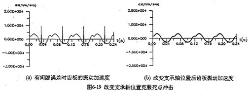 采用雙軸輸人的齒板及箱體軸承座振動(dòng)速度、加速度如圖6-17所示。從圖看出齒板速度及加速度值明顯變。閱屋S輸人時(shí)的0.3倍),而且無沖擊,完全屬于穩(wěn)太振動(dòng)。箱體的振動(dòng)速度及加速度幅值只是單軸輸人時(shí)的0.2倍。圖6-18a是一軸的偏心套存在0.05度的分度誤差時(shí)齒板的加速度曲線圖,圖中明顯出現(xiàn)加速度沖擊棒線。采用雙軸輸入后,死點(diǎn)沖擊被徹底(見圖6-18b) , 變成穩(wěn)態(tài)振動(dòng)曲線了。因此,為了減小三環(huán)減速器的振動(dòng),有必要加大三環(huán)減速器的橫向尺寸,在箱體內(nèi)增加一套雙軸輸入的齒輪功率分流機(jī)構(gòu),或者在箱體外另設(shè)計(jì)一套功率分流機(jī)構(gòu),以解決機(jī)構(gòu)過死點(diǎn)的振動(dòng)問題。