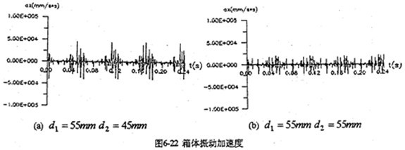 增加高速軸的剛度是降低沖擊載荷的重要途徑。軸的剛度大(值徑大),扭轉(zhuǎn)、彎曲變形小,雙曲柄機(jī)構(gòu)變形也就小,這樣既減小了沖擊振動(dòng)、又增加了軸的強(qiáng)度。圖6-22將高速軸的直徑由原來的45mm加到55mm后的,振動(dòng)加速度圖。