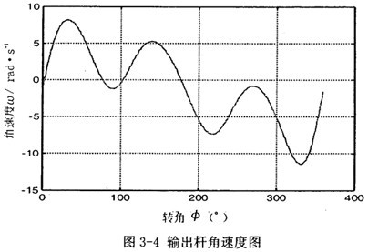 第二種情況 第一輸入速度和第一種情況的速度值相同,現(xiàn)第二輸入經(jīng)螺旋機(jī)構(gòu)轉(zhuǎn)化為往復(fù)運動后,輸入速度為v=sinθ1(θ1為第一輸入角位移),即為滑塊3的速度,再編程計算,得出結(jié)果如圖3-4,圖3-5所示。