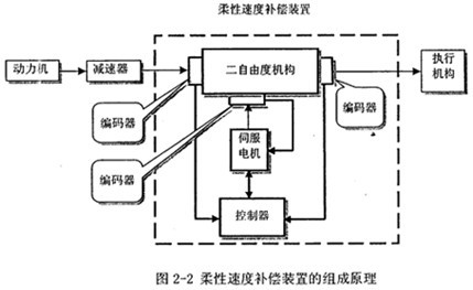 在充分研究可調(diào)整機(jī)構(gòu)、混合驅(qū)動機(jī)器和變速輸入伺服系統(tǒng)的一些研究成果后,交叉融合了他們的一些優(yōu)勢特點,提出柔性速度補(bǔ)償?shù)母拍,它是這樣一類機(jī)器:是針對執(zhí)行機(jī)構(gòu)的負(fù)載引起的速度波動進(jìn)行適度柔性補(bǔ)償?shù)囊活悪C(jī)器,它不是調(diào)節(jié)原動機(jī)和執(zhí)行機(jī)構(gòu),而是在兩者之間單獨設(shè)計一個調(diào)速單元,這一單元由機(jī)械部分和控制部分組成,機(jī)械部分為一多自由度機(jī)構(gòu),由常速電機(jī)和伺服電機(jī)分別驅(qū)動,控制部分包括信息處理系統(tǒng)和檢測系統(tǒng),當(dāng)原執(zhí)行機(jī)構(gòu)的輸出速度產(chǎn)生波動時,檢測系統(tǒng)和控制器檢測判斷波動的大小、位置等數(shù)據(jù),如果超過允許范圍時,由控制器控制伺服電機(jī)動作,經(jīng)控制系統(tǒng)和多自由度機(jī)構(gòu)實時協(xié)調(diào)配合,以產(chǎn)生一個反向速度波,和原速度波正好疊加抵消,達(dá)到適度柔性的速度補(bǔ)償目的,最終為執(zhí)行機(jī)構(gòu)提供一較平穩(wěn)的速度輸入。