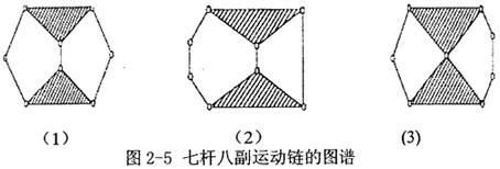 對于(5,5)來說,只有一種連接方式,作為一種混合動力驅(qū)動系統(tǒng)已有人做過研究,在本論文中,不能滿足設(shè)計要求,因此不可。欢9,11)及以上又有40個(或更多)運動鏈之多,且構(gòu)件多結(jié)構(gòu)復(fù)雜,研究起來非常困難,暫不考慮;先考慮(7,8)七桿八副機(jī)構(gòu),其構(gòu)建數(shù)量不是太多,結(jié)構(gòu)不是太復(fù)雜,共有3個運動鏈(如圖2-5),特定化后又有11種(排除同構(gòu)的機(jī)構(gòu))特定化導(dǎo)出機(jī)構(gòu),可以從中選擇可能適合的方案,因此以下將對(7,8)來詳細(xì)分析研究。