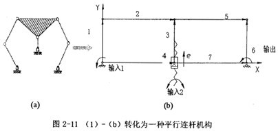方案一:將(3)-(a)一般化鏈的所有連桿標(biāo)號,再分配其中三副桿1作為機(jī)架,哪圖2-9(a)所示,這樣特定化后,再進(jìn)一步轉(zhuǎn)化為(b)圖所示的裝置,連桿5改為滑塊,桿2作為第一輸入,第二輸入可以設(shè)定是滑塊5在桿4上的移動,可由伺服電機(jī)驅(qū)動,桿7作為輸出桿,可以滿足設(shè)計的初步要求。