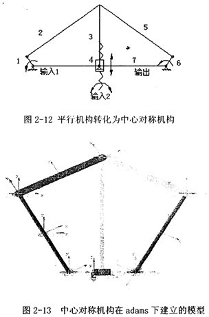 這種平行桿機(jī)構(gòu)理論上正確,但是實際上運行時會產(chǎn)生奇異,不能實際采用,因此轉(zhuǎn)化為如圖2-12所示的這種中心對稱的連桿機(jī)構(gòu)。并在adams軟件下建立了模型如圖2-13,經(jīng)分析認(rèn)為該機(jī)構(gòu)完全對稱的結(jié)構(gòu)特征,更適合于一般情況下的速度等速傳遞,不適合在沖壓工況下應(yīng)用,所以這種結(jié)構(gòu)也決定不采用。
