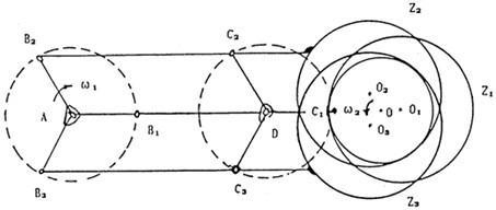 眾所周知,雙曲柄機(jī)構(gòu)的最大缺點(diǎn)就是存在死點(diǎn)位置,即當(dāng)曲柄,與連桿共線時(shí),機(jī)構(gòu)處理運(yùn)動(dòng)不確定位置,其傳動(dòng)角為零,機(jī)械無(wú)法運(yùn)動(dòng)。為了克服死點(diǎn)位置,目前已出現(xiàn)了三種解決方法:其一是在同一行星輪上布置多套雙曲柄機(jī)構(gòu)的方法:其二是采用雙曲柄動(dòng)力輸入式方法;基三是采用多相并列式雙曲柄機(jī)構(gòu)來(lái)克服死點(diǎn)的方法。三環(huán)減速器就是用三相并列雙曲柄機(jī)構(gòu)來(lái)克服死點(diǎn)位置,如圖2-2所示。