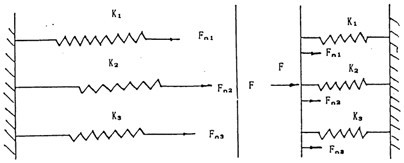 實(shí)際上,環(huán)板的受力與Fn(ф)有關(guān),因?yàn)槿龎K環(huán)板共同受載時(shí)彼此約束,構(gòu)成靜不定系統(tǒng),如簡(jiǎn)化模型圖2-8所示。