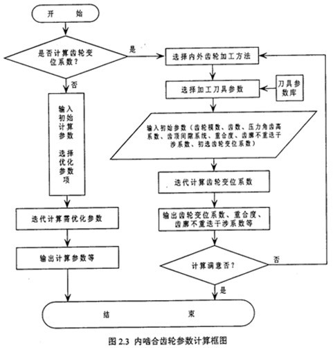 在少齒差內(nèi)嚙合傳動中,變位系數(shù)的確定是設(shè)計的關(guān)鍵。齒輪的實(shí)際幾何尺寸與齒輪的加工方法有直接的關(guān)系,所以用不同的齒輪加工方法的計算公式來推導(dǎo)變位系數(shù)的迭代公式,所得迭代結(jié)果不一樣。內(nèi)嚙合齒輪參數(shù)計算模塊中,已經(jīng)由公式(2.5 )~(2.9 )推導(dǎo)了少齒差內(nèi)嚙合傳動的各種實(shí)際加工情況下的變位系數(shù)的計算迭代公式,圖(2.3)為齒輪變位系數(shù)計算框圖。