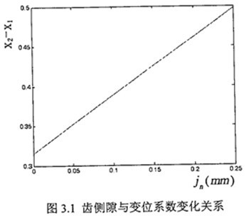 由3.2圖可以看出,當(dāng)齒側(cè)隙jn由0變化至.25毫米時(查資料取較大最小側(cè)隙參考值),齒輪變位系數(shù)差X2-X1的變化量由近0.32變化到0.50,變化了約0.18。