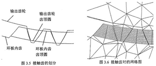 因為在少齒差內(nèi)嚙合中,不處于嚙合位置的齒對在進(jìn)入嚙合之前以及在脫離嚙合之后,其內(nèi)、外齒廓間的間隙非常小,因此雙環(huán)減速器環(huán)板內(nèi)齒輪嚙合傳動在載荷作用下,因彈性變形實際接觸齒對數(shù)遠(yuǎn)大于理論重合度,在傳遞載荷的過程中,輪齒的變形量要大于一部分齒對的間隙,這些齒對就要接觸并同時分擔(dān)載荷,這就大大提高了整個齒輪傳動裝置的承載能力。同時實際齒輪的接觸對數(shù)及接觸應(yīng)力,隨著載荷增大而相應(yīng)增加。因而少齒差內(nèi)嚙合行星齒輪傳動的實際接觸齒對數(shù)的確定,對齒輪承載能力的估算以及齒輪模數(shù)的正確確定具有重要意義。對于齒輪的接觸問題的,國內(nèi)外學(xué)者對此已作了不少研究,取得一些研究成果。然而這些研究有的沒有考慮誤差的影響,有的僅考慮內(nèi)外嚙合齒輪副齒廓理論間隙,沒有考慮輪齒制造誤差和輪齒的彈性變形的影響。本文對于環(huán)板內(nèi)齒輪接觸問題進(jìn)行了計算,計算時考慮內(nèi)外嚙合齒輪副齒廓理論間隙、制造誤差及輪齒彈性變形的影響,在此基礎(chǔ)上,建立了少齒差內(nèi)嚙合行星齒輪傳動實際接觸齒對數(shù)及各齒間載荷分配的理論分析計算的實體模型,利用I-DEAS軟件進(jìn)行了環(huán)板內(nèi)齒輪接觸有限元計算,并用該軟件分析計算了在不同載荷工況下的實際接觸齒對數(shù)、最大接觸應(yīng)力以及兩環(huán)板上各接觸齒的載荷分配情況。