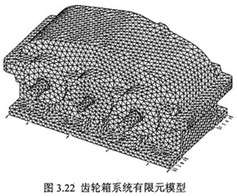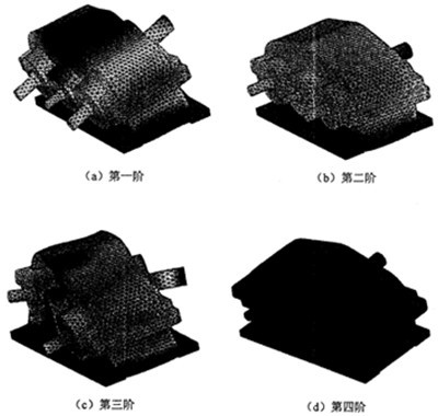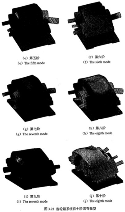如圖3.22 所示的齒輪系統(tǒng)有限元模型,根據(jù)實際的安裝情況,為了能比較準(zhǔn)確地反映實際狀態(tài),箱體的邊界條件為:箱體底座垂直方向約束,四個螺栓孔處全部固定約束。則研究齒輪系統(tǒng)的約束模態(tài),表3.14~3.15分別為用I-Deas軟件的Lanczos模態(tài)求解法計算得到的各重要零部件及齒輪系統(tǒng)前上10階固有頻率和響應(yīng)的振型情況。限于篇幅,圖3.23給出了齒輪系統(tǒng)的前十階固有振型。