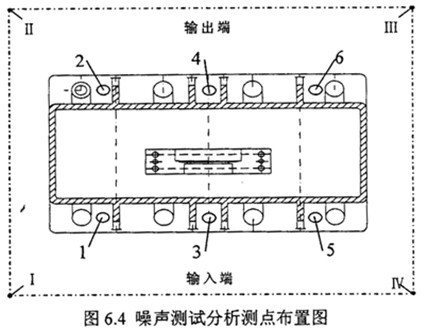 結(jié)構(gòu)振動(dòng)噪聲測(cè)試在齒輪箱安裝基腳布置6個(gè)測(cè)點(diǎn),測(cè)點(diǎn)布置圖見圖3中1-6測(cè)點(diǎn),在每一測(cè)點(diǎn)上按31.5Hz~5kHz1/3倍頻中心頻率測(cè)試加速度級(jí)頻譜(re:a0=10-6m/s)和1/3倍頻中心頻率測(cè)試速度級(jí)頻譜(re:a0=5*10-8m/s)?諝庠肼暅y(cè)試聲壓級(jí)基準(zhǔn)2*10-5Pa,用聲級(jí)計(jì)上的A計(jì)權(quán)聲壓級(jí)和1/1倍頻程聲壓級(jí)測(cè)量減速齒輪裝置各個(gè)測(cè)點(diǎn)。各測(cè)點(diǎn)距齒箱測(cè)量表面的距離為1米。測(cè)點(diǎn)位置見測(cè)點(diǎn)布置圖6.4中Ⅰ-Ⅳ測(cè)點(diǎn)。