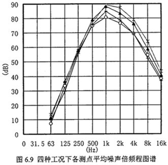 圖6.9為四種工況平均空氣噪聲倍頻程圖譜。由于減速齒輪裝置只是整個(gè)試驗(yàn)系統(tǒng)的一部