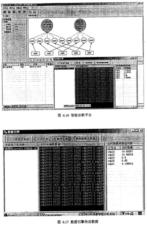 綜上分析,采用人機(jī)交互方式將Zdp14、Zdp15等參數(shù)輸入計(jì)算機(jī),智能診斷系統(tǒng)得到雙環(huán)減速器故障診斷結(jié)果,偏心軸彎曲故障,程度值在0~1范圍變化,齒形誤差較大。智能診斷結(jié)果如圖6.15所示。圖6.16是智能診斷平臺(tái)進(jìn)行現(xiàn)場(chǎng)一線診斷分析,圖6.17是數(shù)據(jù)引擎進(jìn)行實(shí)時(shí)數(shù)據(jù)接收和數(shù)據(jù)發(fā)送。