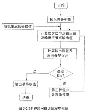三層前饋型BP網(wǎng)絡(luò)采用BP算法來調(diào)整網(wǎng)絡(luò)連接權(quán)值和節(jié)點(diǎn)閾值。BP算法,即誤差逆?zhèn)鞑W(xué)習(xí)方法,是一種曲型的誤差修正方法。BP算法是一個種有教師的學(xué)習(xí)算法,整個網(wǎng)絡(luò)學(xué)習(xí)過程由信息的正向傳動播和誤差的反向傳播兩上階段構(gòu)成,在正向傳播的過程中,輸入信息從輸入層經(jīng)隱含層逐層處理,并傳向輸出層,如果不能在輸出層得到期望的輸出,則轉(zhuǎn)入反向傳播,運(yùn)用梯度下降法連接權(quán)關(guān)于誤差函數(shù)的導(dǎo)數(shù)沿原來的連接通路返回,通過修改各層的權(quán)值使得誤差函數(shù)減小,直到達(dá)到收斂為止。神經(jīng)網(wǎng)絡(luò)練過程如圖5-2所示。