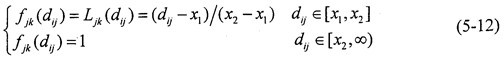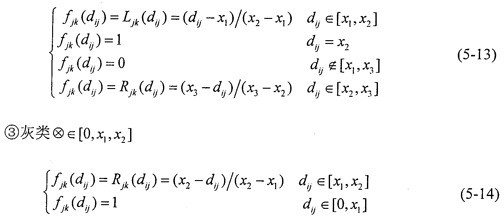 4.進(jìn)行灰色聚類 對象矩陣進(jìn)行聚類,聚類類別選為“1”、“2”、“3”三類時,其白化權(quán)函數(shù)分別與式(5-12)~(5-14)和圖5-4對應(yīng)。