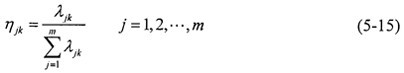 對象矩陣進(jìn)行聚類,聚類類別選為“1”、“2”、“3”三類,其白化函九分別與式(5-12)~(5-14)和圖5-4對應(yīng),F(xiàn)以f1為例,說明求得白化函數(shù)閾值的方法。對應(yīng)象矩陣中的第一列,d(max)=1;d(mean)=0.917,取0.9,d(min)=0.8621,取0.86。因此,對于灰類1,有x1=0,x2=1;對于灰類2,有x1=0,x2=0.9,x3=2×x2=1.8;對于灰類3,有x1=0.86,x3=2×x1=1.72。同理可求出其余各分目標(biāo)各類白化權(quán)的閾值,代入式(5-12)~(5-14)中求出各類白化權(quán)函數(shù)及其值。按式(5-15)求出標(biāo)定聚類權(quán)矩陣η