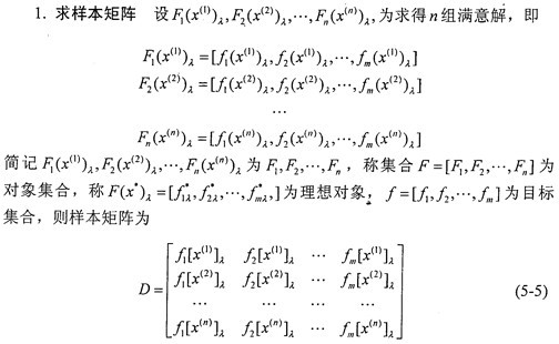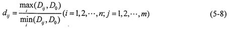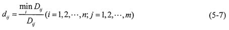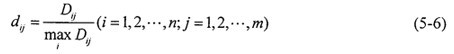 2.求轉(zhuǎn)換樣本矩陣 即象矩陣 由于指標(biāo)不同,要求不同,因此有必要按上限效果測度、下限效果測度、中心效果測度來統(tǒng)一樣本。當(dāng)指標(biāo)要求“越大越好”時,可用上限效果測度,記統(tǒng)一后的樣本為dij,則有