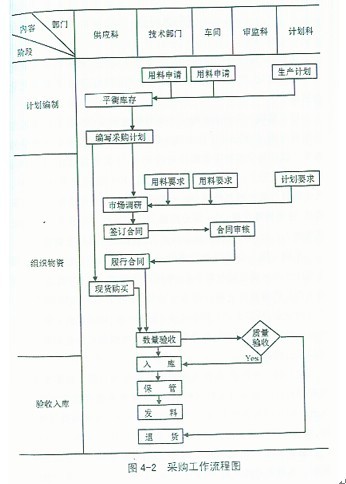 第四步競(jìng)購。由進(jìn)入競(jìng)購范圍的供應(yīng)單位或個(gè)人向供應(yīng)科提交申報(bào)單,載明:所競(jìng)購物資名稱、產(chǎn)地、規(guī)格、數(shù)量、質(zhì)量、價(jià)格、交貨期、供應(yīng)渠道、售后服務(wù)等,一式兩份呈報(bào)物管辦和供應(yīng)科公開進(jìn)行競(jìng)購。供應(yīng)科根據(jù)生產(chǎn)供應(yīng)計(jì)劃和所掌握的最低競(jìng)價(jià),選定2~3家為供貨單位,報(bào)物管辦備查。最后由供應(yīng)科與供貨單位簽訂合同,具體實(shí)施物資采購進(jìn)廠。 競(jìng)購成功并簽訂合同的供貨單位須按合同要求,及時(shí)、保質(zhì)保量地供貨。若中途違約或物資使用過程中發(fā)現(xiàn)內(nèi)在質(zhì)量問題而造成損失、影響生產(chǎn),則按規(guī)定承擔(dān)違約責(zé)任。凡違約或質(zhì)量問題影響生產(chǎn)兩次以上者,一律取消其競(jìng)購資格。 全程監(jiān)控 為明確各方面責(zé)任,公司從提出用料申請(qǐng)、編制物資采購計(jì)劃開始,到驗(yàn)收入庫、生產(chǎn)使用為止,制定了詳細(xì)的業(yè)務(wù)流程,所有環(huán)節(jié)一律按工作程序進(jìn)行全程管理。詳見圖4—2采購工作流程圖。 成本管理科將上述流程活動(dòng)中所涉及的各類信息資料如原輔材料的價(jià)格、質(zhì)量、數(shù)量、供貨單位及聯(lián)系人、責(zé)任人等輸入微機(jī),隨時(shí)進(jìn)行查詢、分析、全程追蹤監(jiān)控。