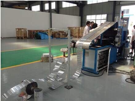 鋁箔通過沖床進(jìn)行自動沖片成型,通過聯(lián)動控制,保證沖床對自動插片脹管機(jī)的沖片均衡供應(yīng)。由插片脹管機(jī)自動完成翅片的切片、插片、排列,并在預(yù)先設(shè)置的翅片數(shù)量達(dá)標(biāo)時(shí)停止插片,并自動將模具推出至待插脹管位置;另一側(cè)由人工將預(yù)先成型好的彎管插入脹管機(jī),按下啟動按鈕,系統(tǒng)完成自動對齊、脹管、退出、脫模等程序,人工取下成品,并進(jìn)行下一個循環(huán)。