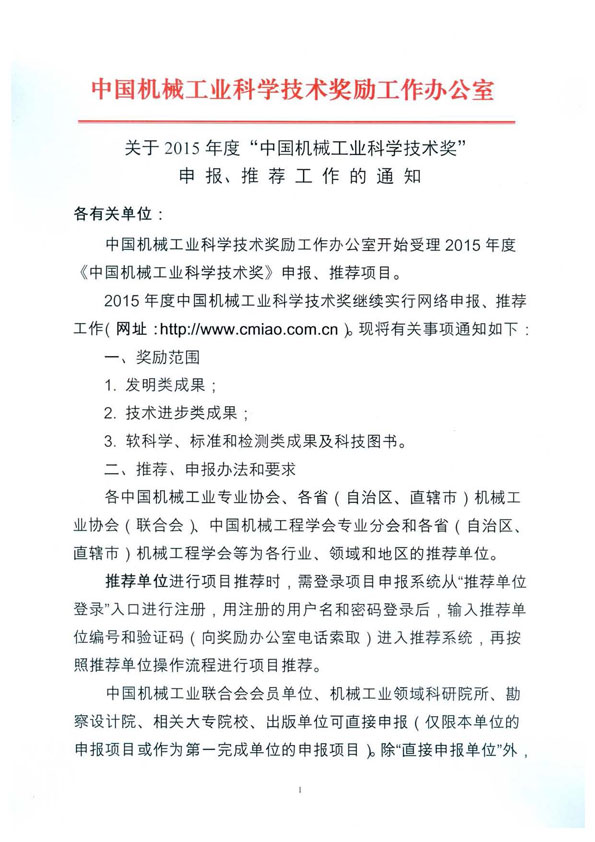 關(guān)于2015年度“中國機械工業(yè)科學(xué)技術(shù)獎”申報、推薦工作的通知