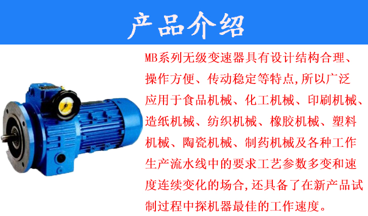 MB系列無(wú)級(jí)變速器具有設(shè)計(jì)結(jié)構(gòu)合理、操作方便、傳動(dòng)穩(wěn)定等特點(diǎn),所以廣泛應(yīng)用于食品機(jī)械、化工機(jī)械、印刷機(jī)械、造紙機(jī)械、紡織機(jī)械、橡膠機(jī)械、塑料機(jī)械、陶瓷機(jī)械、制藥機(jī)械及各種工作生產(chǎn)流水線中的要求工藝參數(shù)多變和速度連續(xù)變化的場(chǎng)合,還具備了在新產(chǎn)品試制過(guò)程中探求機(jī)器最佳的工作速度。