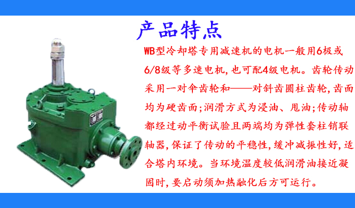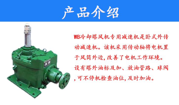 WB冷卻塔風機專用減速機是臥式外傳動減速機。該機采用傳動軸將電機置于風筒外邊,改善了電機工作環(huán)境。設有塔外油標及加、放油管路、球閥,可不停機檢查油位,及時加油。