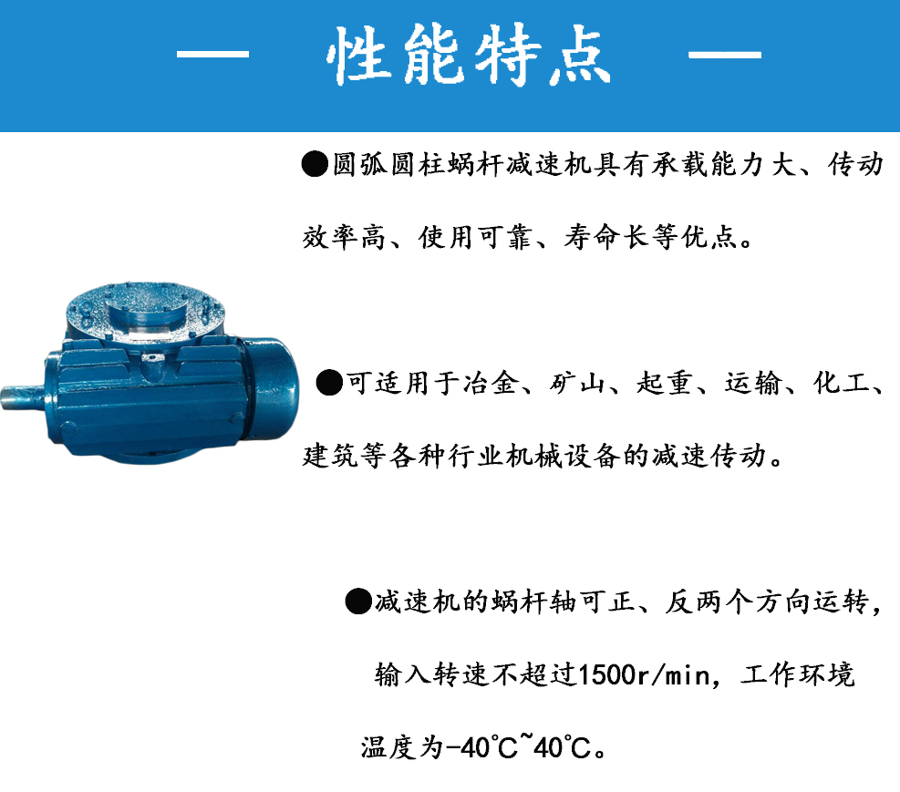 圓弧圓柱蝸桿減速機(jī)具有承載能力大、傳動(dòng)效率高、使用可靠、壽命長等優(yōu)點(diǎn),可適用于冶金、礦山、起重、運(yùn)輸、化工、建筑等各種行業(yè)機(jī)械設(shè)備的減速傳動(dòng)。減速機(jī)的蝸桿軸可正、反兩個(gè)方向運(yùn)轉(zhuǎn),輸入轉(zhuǎn)速不超過1500r/min,工作環(huán)境溫度為-40℃-40℃。
