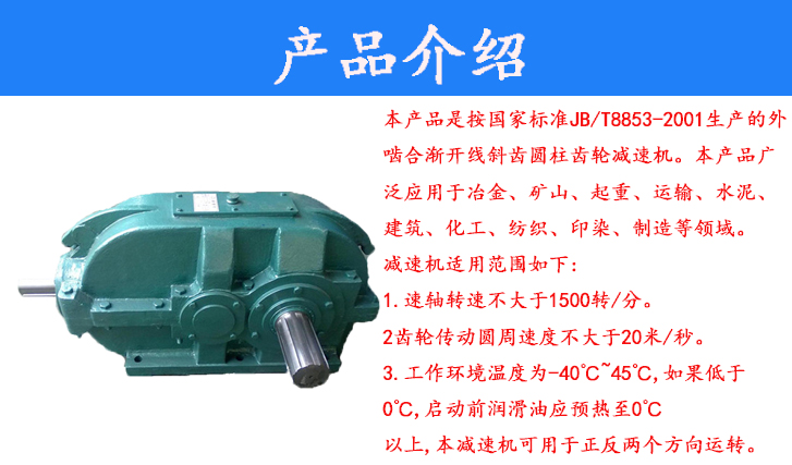 DBY、DCY、DFY系列減速器分別為二級(jí)傳動(dòng)、三級(jí)傳動(dòng)和四級(jí)傳動(dòng)的輸入、輸出軸位于垂直狀態(tài)的外嚙合齒輪傳動(dòng)機(jī)構(gòu),符合JB/T8853-1999標(biāo)準(zhǔn)?扇〈鶶S型垂直軸減速器和ZQ、ZL、等舊型號(hào)減速器,亦可替代同類型國外進(jìn)口減速器。