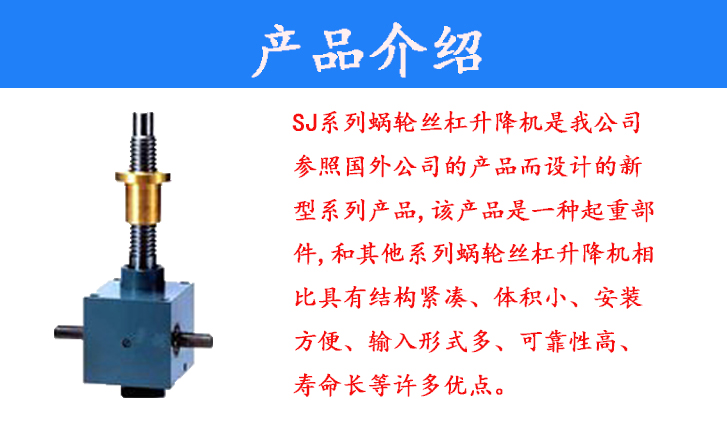 SJ系列蝸輪絲杠升降機(jī)是我公司參照國(guó)外公司的產(chǎn)品而設(shè)計(jì)的新型系列產(chǎn)品,該產(chǎn)品是一種起重部件,和其他系列蝸輪絲杠升降機(jī)相比具有結(jié)構(gòu)緊湊、體積小、安裝方便、輸入形式多、可靠性高、壽命長(zhǎng)等許多優(yōu)點(diǎn)。