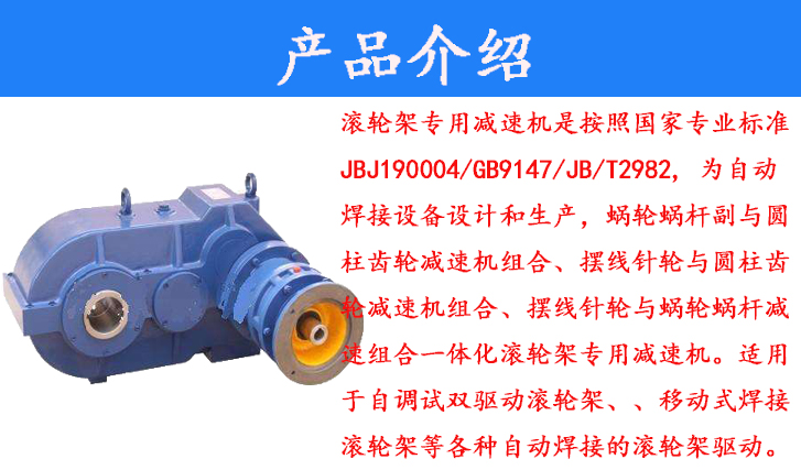 滾輪架專用減速機(jī)是按照國家專業(yè)標(biāo)準(zhǔn)JB19004/GB9147/JB/T2982,為自動焊接設(shè)備設(shè)計(jì)和生產(chǎn)的,蝸輪蝸桿副與圓柱齒輪減速機(jī)組合、擺線針輪與圓柱齒輪減速機(jī)組合,擺線針輪與蝸輪蝸桿減速組合一體化滾輪架專用減速機(jī)。適用于自調(diào)式雙驅(qū)動滾輪架、移動式焊接滾輪架等各種自動焊接的滾輪架驅(qū)動。