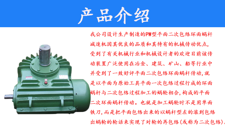 我公司設計生產制造的PW型平面二次包結環(huán)面蝸桿減速機因其優(yōu)良的品質和其特有的機械傳動優(yōu)點,受到了有關機械行業(yè)和機械設計者的歡迎目前該傳動裝置廣泛使用在冶金、建筑、礦山、船等行業(yè)中并受到了一致好評平面二次包絡環(huán)面蝸桿傳動,就是以平面為原始工具平面一次包絡過程行成的環(huán)面蝸桿與二次包絡過程加工的蝸輪相合,構成的平面二次環(huán)面蝸桿傳動。也就是加工蝸輪時不是用單面鐵刀,而是把平面包絡出來的以蝸桿型左的滾到包絡出蝸輪的輪話來實現了對輪的再包結(或稱為二次包絡)