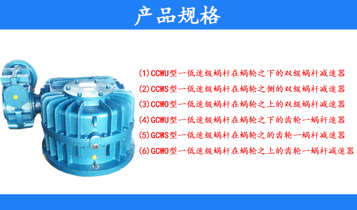 按低速級蝸桿置向不同可分為:蝸桿下置式、蝸桿側置式、蝸桿上置式三種結構型式具有承載能力高、傳動效率高,傳動比大、結構緊湊等特點