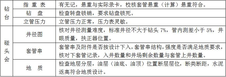 2、固井施工:按設(shè)計注入隔離液,水泥漿壓膠塞,頂替鉆井液、碰壓、試壓完成、固井施工過程檢查點項及要求如下: