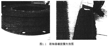 彈性聯(lián)軸器是應(yīng)用廣泛的機(jī)械零部件,在工業(yè)生產(chǎn),石油,化工,冶金等工業(yè)部門都有應(yīng)用,彈性聯(lián)軸器的使用狀況直接關(guān)系到機(jī)械設(shè)備的安全及壽命問題,尤其是一些重要場(chǎng)合,彈性聯(lián)軸器的失效問題往往引起人們的極大關(guān)注,例如某公司的GKZ型內(nèi)燃機(jī)車采用MTU16V396TC14型柴油機(jī)做內(nèi)燃機(jī)。MTU柴油機(jī)與風(fēng)扇偶合器采用萬向軸來傳遞動(dòng)力。為了緩和沖擊力,柴油機(jī)輸出軸與萬向軸聯(lián)接采用彈性聯(lián)軸器。0002#機(jī)車使用7年后,彈性聯(lián)軸器被剪斷,剪斷后的聯(lián)軸器如圖1.1所示。更換同種型號(hào)的彈性聯(lián)軸器后,使用未到一年又被剪斷,而同一型號(hào)的0001#,0003#機(jī)車使用時(shí)間以達(dá)9年,但彈性聯(lián)軸器依然完好如初。