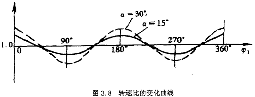 當(dāng)主動轉(zhuǎn)子的回轉(zhuǎn)角速度為常數(shù)時(shí),從動轉(zhuǎn)子的角速度是偏角和主動轉(zhuǎn)子轉(zhuǎn)角的函數(shù)。當(dāng)或ф1=00或1800時(shí),ω2最大,當(dāng)ф2=900獲2700時(shí),ω2最小。其轉(zhuǎn)速比變化曲線如圖3.8所示,即有ω1cosa≤ω2≤
