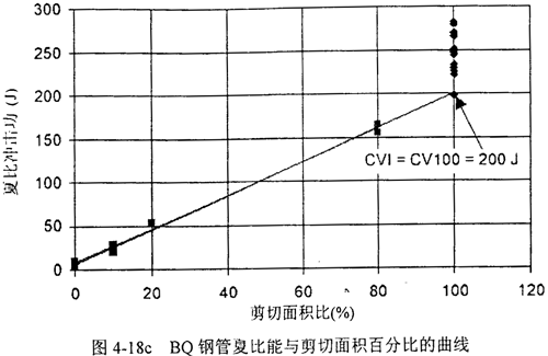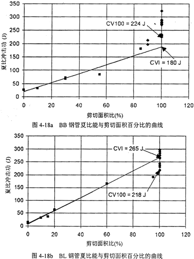 圖4-18a,b,c給出了三家鋼管的夏比能與剪切面積的關(guān)系,以及85%剪切面積對(duì)應(yīng)的轉(zhuǎn)變溫度。圖中CV100表示100%剪切面積時(shí)最低的夏比能,CVI表示最低夏比平臺(tái)能,也稱(chēng)夏比轉(zhuǎn)變能,CVP表示夏比平臺(tái)能。菱形實(shí)驗(yàn)點(diǎn)表示剪切面積高于90%,方形實(shí)驗(yàn)點(diǎn)表示低于90%可以看到,剪切面積低于90%時(shí),夏比能與剪切面積呈線(xiàn)性關(guān)系。