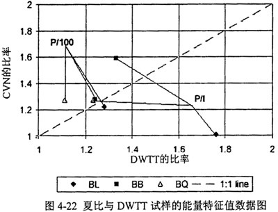 圖4-22是CVN與DWTT試樣的上臺(tái)能量特征值數(shù)據(jù)圖。總的來(lái)說(shuō),CVN與DWTT試樣的特征能量比率有較好的一致性。圖中P/100的符合性比P/I更好,很大程度上是因?yàn)镃V100、DWTT-100比CVN-I、DWTT-I的獲得方法更為明確。