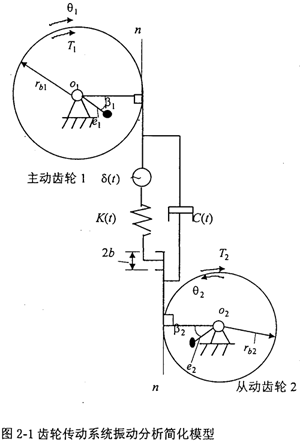 圖2-1中,rb1——主動齒輪基圓半徑;rb2——從動齒輪基圓半徑;K(t)——齒輪嚙合剛度;e1——主動齒輪偏心距;e2——從動齒輪偏心距;β1——主動齒輪不平衡質量的初始角度;β2——從動齒輪不平衡質量的初始角度;δ(t)——齒輪的綜合誤差;JD1——主動齒輪轉動慣量;JD2——從動齒輪轉動慣量;C(t)——齒輪阻尼系數(shù);b——齒側間隙;n-n——齒輪嚙合線方向。