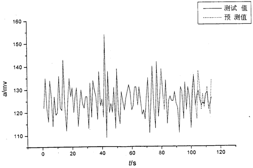 本節(jié)對(duì)在某車床上采集的振動(dòng)信號(hào)用AR(M)模型進(jìn)行預(yù)測(cè),表6-8為測(cè)試數(shù)據(jù)值,預(yù)測(cè)結(jié)果見圖6-5(圖中,a-振動(dòng)加速度,t-時(shí)間),與實(shí)測(cè)結(jié)果相比,AR(M)模型預(yù)測(cè)誤差最大點(diǎn)為6.22%,最小點(diǎn)為0.34%,基本符合預(yù)測(cè)要求。