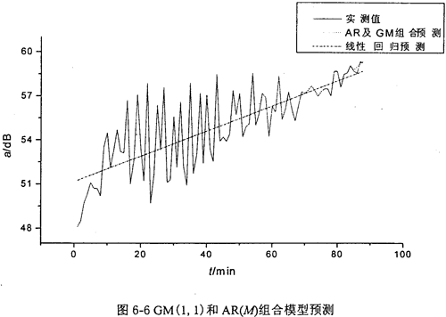 表6-9是在某軸承座上測(cè)得的振動(dòng)加速度信號(hào),經(jīng)檢驗(yàn)該時(shí)間序列為一個(gè)非平穩(wěn)序列,現(xiàn)用GM(1,1)和AR(M)組合模型預(yù)測(cè)第85至第88個(gè)數(shù)據(jù)點(diǎn),預(yù)測(cè)結(jié)果見圖6-6。預(yù)測(cè)誤差最大點(diǎn)為1.7%,最小點(diǎn)為0.33%。圖6-6中還畫出了有線性回歸模型預(yù)報(bào)的結(jié)果,預(yù)報(bào)誤差最大達(dá)2.23%。