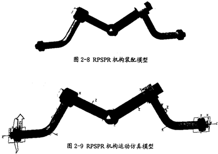 在圖2-8所示模型的基礎(chǔ)上,通過在各構(gòu)件間加上運動副,在運動副上施加運動驅(qū)動,即可得到此機(jī)構(gòu)的運動仿真模型(如圖2-9所示)。在此模型的建立過程中嚴(yán)格保證各構(gòu)件的共面,其運動副的形式同圖2-2中的RPSPR機(jī)構(gòu)均相同。這樣在此模型中有4個構(gòu)件(不含機(jī)架)、有2個旋轉(zhuǎn)副、有2個移動副、有l(wèi)個球面副、模型有l(wèi)個自由度,再加上l個運動驅(qū)動即可得到完整的仿真模型。不過此模型并不滿足鏡面機(jī)構(gòu)的條件。
