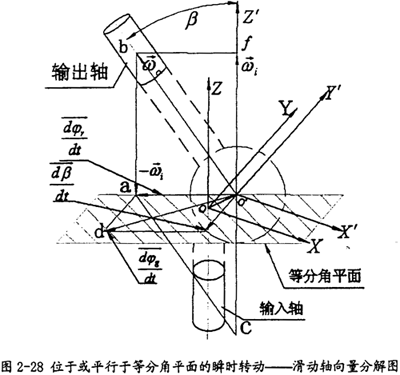 如圖2-28所示,輸入軸與輸出軸通過一個(gè)萬向聯(lián)軸器J聯(lián)接,兩軸夾角β為變量,輸出軸相對于輸入軸存在瞬時(shí)轉(zhuǎn)動(dòng)——滑動(dòng)軸,用矢量